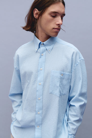 We have combined a more oversized silhouette with the finest fabrics to offer shirts that never go out of style. This one comes in our popular seersucker, a fun texture in solid colors, cool for office meetings or evening gatherings.
